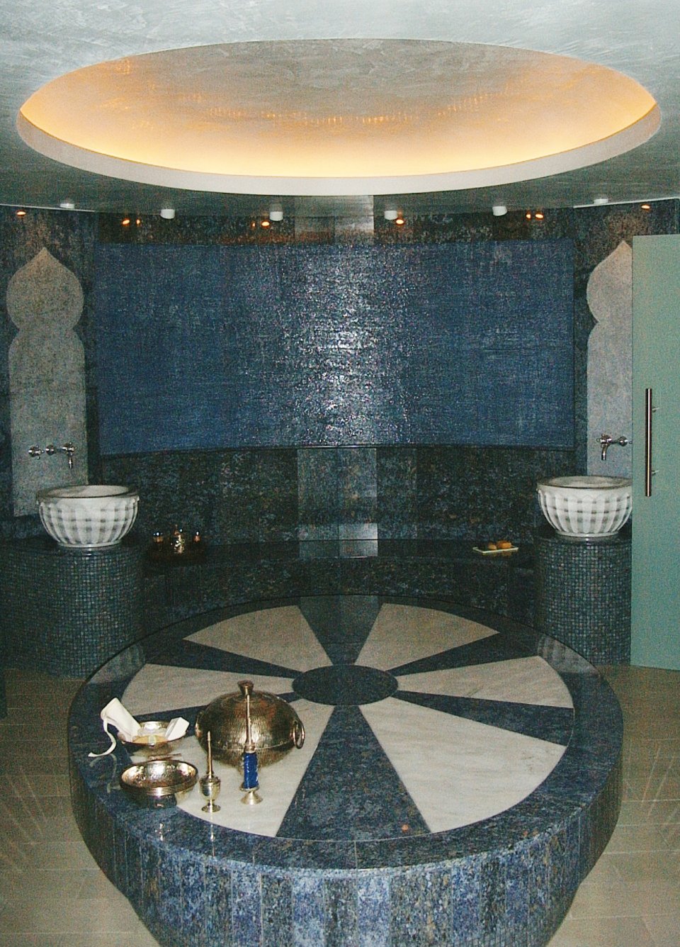 - Binnenzijde: wanden van jadegroene glaspanelen